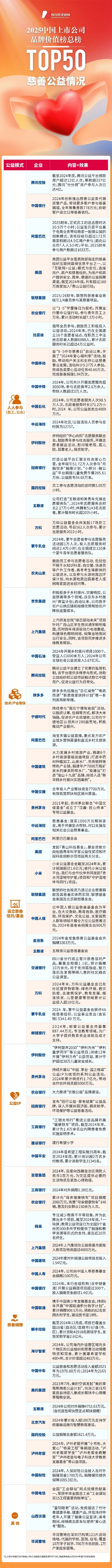 《每日经济新闻》记者依据《2025中国上市公司品牌价值榜总榜TOP100》,深度梳理了前50家企业的2024年度ESG(环境、社会和公司治理)相关报告,希望了解中国大企业的公益慈善事业是怎么开展的,有哪些具体路径,是否可持续……