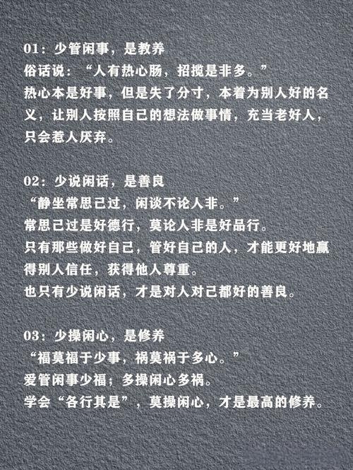 尝试一天:少管一件他人的闲事,少说一句评判的话语,少操一份无谓的心。你会发现,世界并未因此混乱,反而多了些自在的秩序;关系并未疏远,反而因少了压力而更亲近;而你自己的内心,则有了空间容纳长久以来被忽略的——自己的需求、梦想与平静。