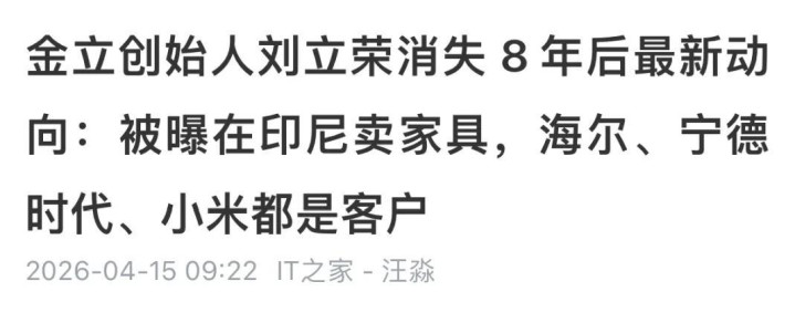 IT之家《金立创举东说念主刘立荣褪色8年后最新动向:被曝在印尼卖产品,海尔、宁德时间、小米都是客户》,2026年4月15日