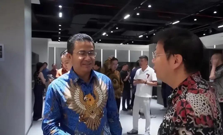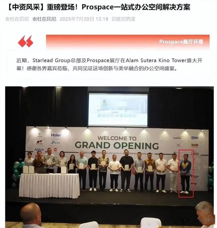 像片是客岁7月20号那天拍的,雅加达Alam Sutera区Kino Tower楼里,一家叫Starlead Group的产品集团总部开业剪彩。像片最右边,一个晒得暗淡的中年男东说念主,衣服蓝色的印尼巴迪克传统花衬衫,笑颜满面地站在合影的C位。自后有东说念主把今日的现场视频翻出来,面部特写拍得清走漏爽即是刘立荣。