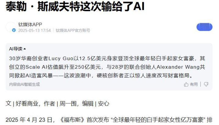 泰勒・斯威夫特此次输给了AI 钛媒体APP 2025-05-13 17:54钛媒体APP官方账号