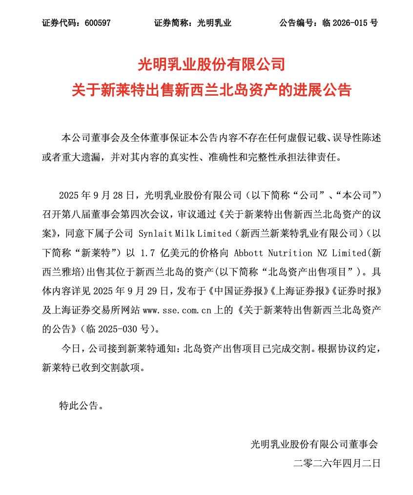 4月3日,光明乳业发布公告,以1.7亿好意思元(约12.1亿元东说念主民币)将新莱特北岛钞票出售给好意思国医疗巨头雅培旗下子公司,交割完成,款项已全额到账。