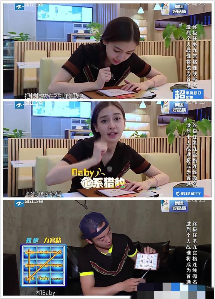 2016年《奔走吧昆季》第四季Rain作客那期,baby主动找到郑恺缔盟,两东谈主在九宫格任务里,都把对方放在不会彼此淘汰的位置,信任度了然于目。