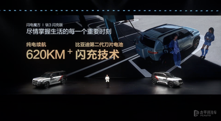 3月5日,方程豹钛3闪充版慎重发布,新车搭载了比亚迪第二代刀片电板和闪充工夫,CLTC纯电续航最高620km,SOC10%-97%闪充仅需9分钟,并搭载最大功率240千瓦电机,将于3月13日慎重上市。行为参考,现金钛3售价区间为13.38-17.78万元。