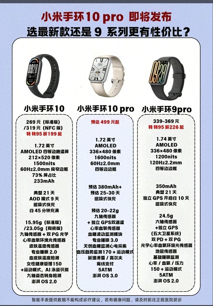 5:价钱方面,小米手环10系列的订价政策也颇具劝诱力,表率版起售价为269元,NFC版起售价为319元,Pro版预估起售价为499元,这一价钱区间笼罩了从初学到中高端的无为用户群体,用户可以凭据我方的预算和需求遴荐合乎的版块,比拟之下,小米手环9 Pro的售价在339元至369元之间,诚然价钱相对较低,但在功能和成就上照旧无法与小米手环10系列相忘形,关于追求性价比的用户来说,小米手环10表率版无疑是一个极具劝诱力的遴荐,而关于追求更高品性体验的用户来说,小米手环10 Pro的预估价钱也显得物超所值。