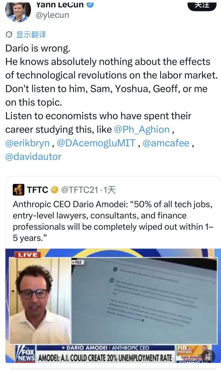 Dario曾公开默示,明天一到五年,科技、法律洽商、金融等领域一半岗亭将被AI透彻取代,此类顶点言论在行业内不断发酵,激勉多数从业者慌张情感。而LeCun径直淆乱行业滤镜,指出AI研究者只精明技巧层面的技艺,却对企业组织架构、法律合规截止、市集供需关系以及社会初始逻辑一无所知。