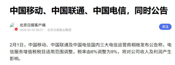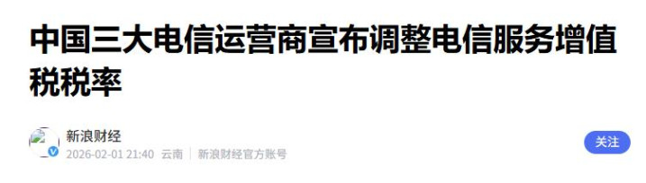 好多东谈主把此次风云的起源指向税率调遣,官方公布音讯,从2026年1月1日起,手机流量、短信、宽带接入等业务的升值税税率从6%调遣为9%。