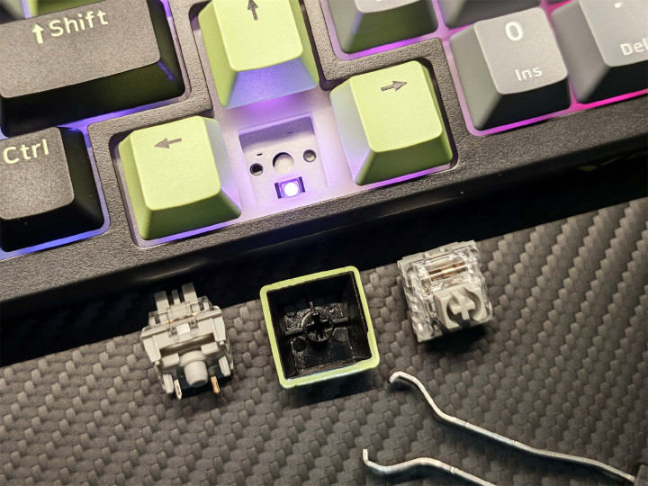 当作主打DIY的键盘,它搭载凯华热插拔轴座,可耐受5000次插拔,兼容市面主流5脚轴体,免焊合直插直换,搭配附赠的拔轴器旧可以用上了,生人一样讲理换。